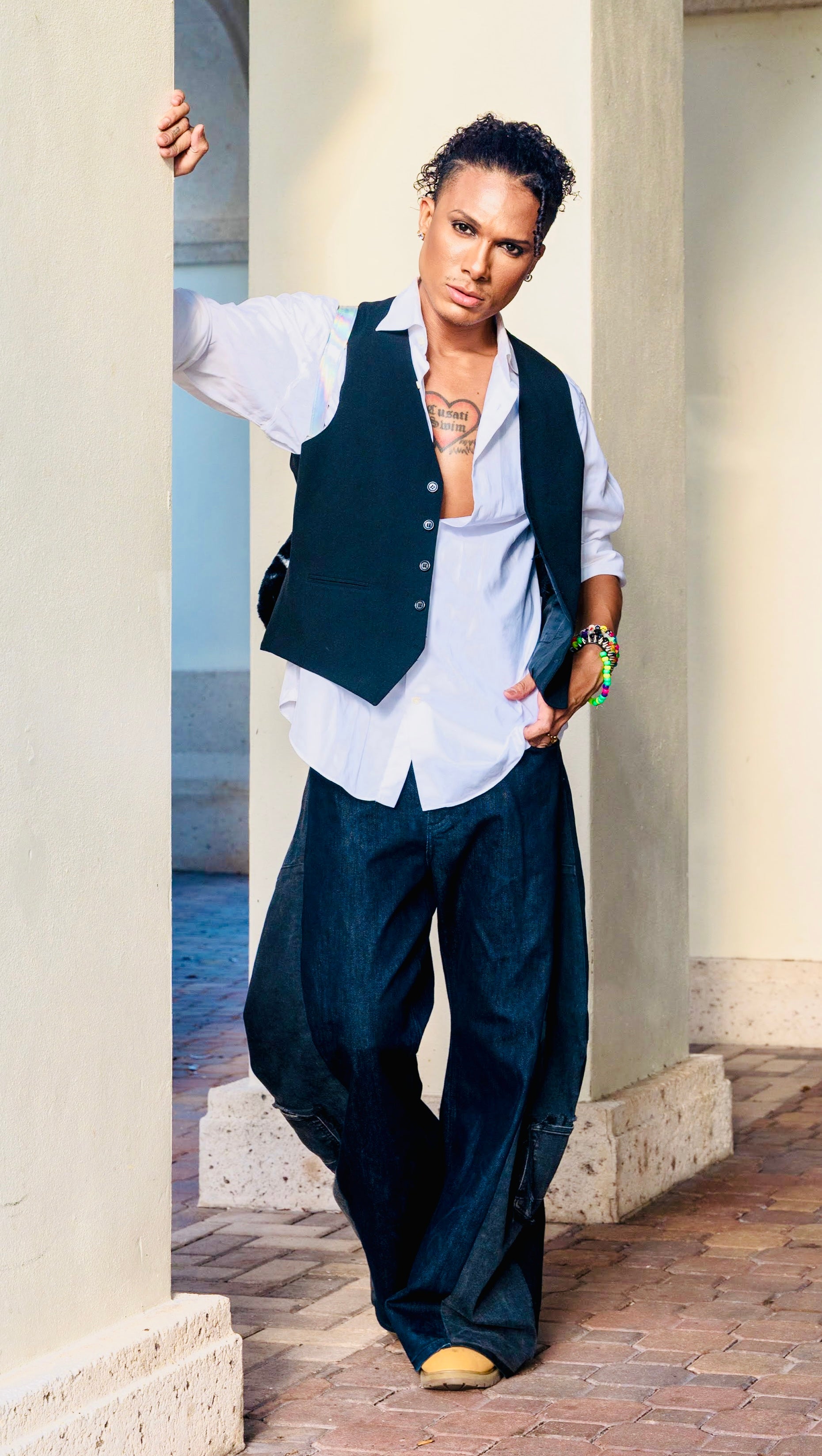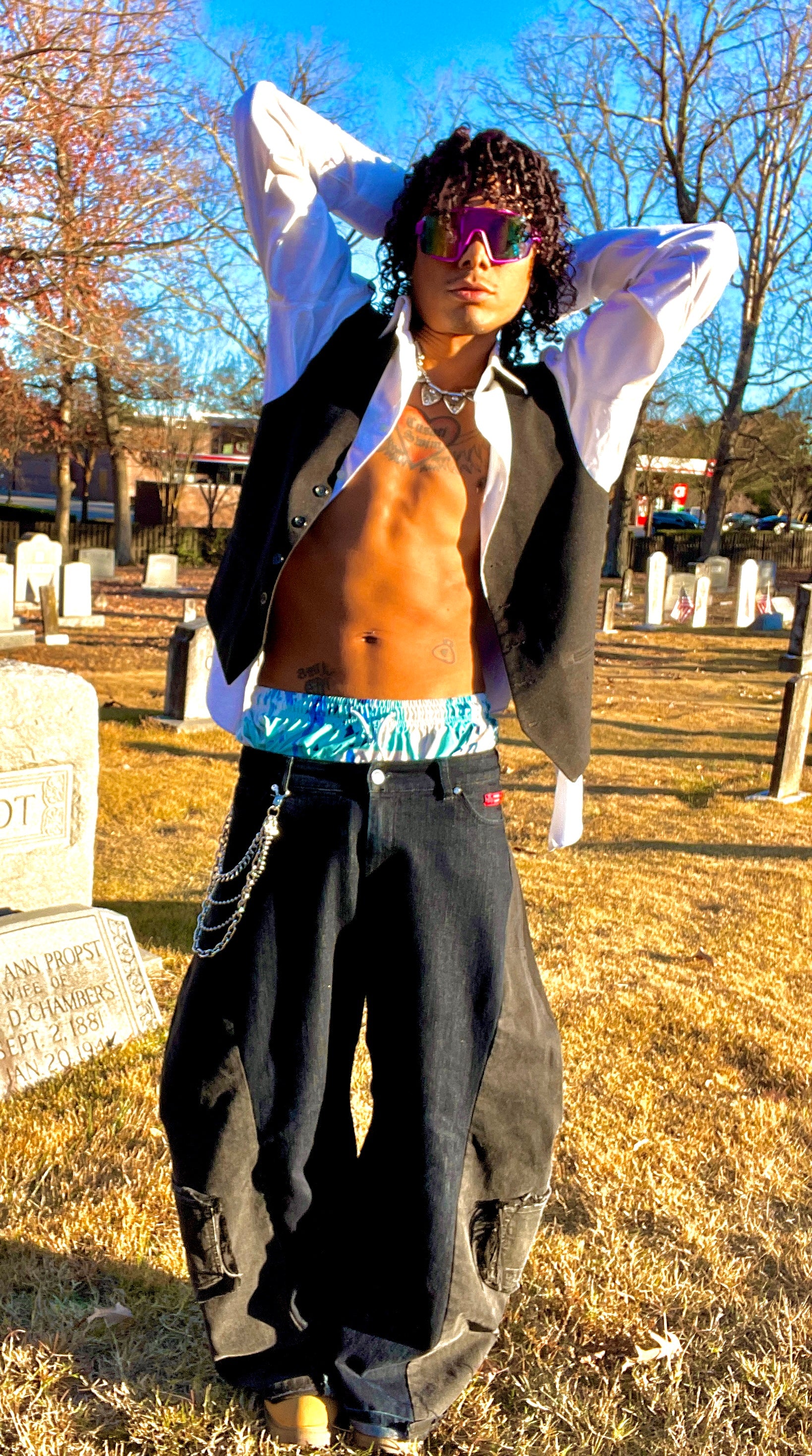 - Features an extra baggy fit with a functional side pocket with frayed edges, originally a back pocket, hand-stitched into place