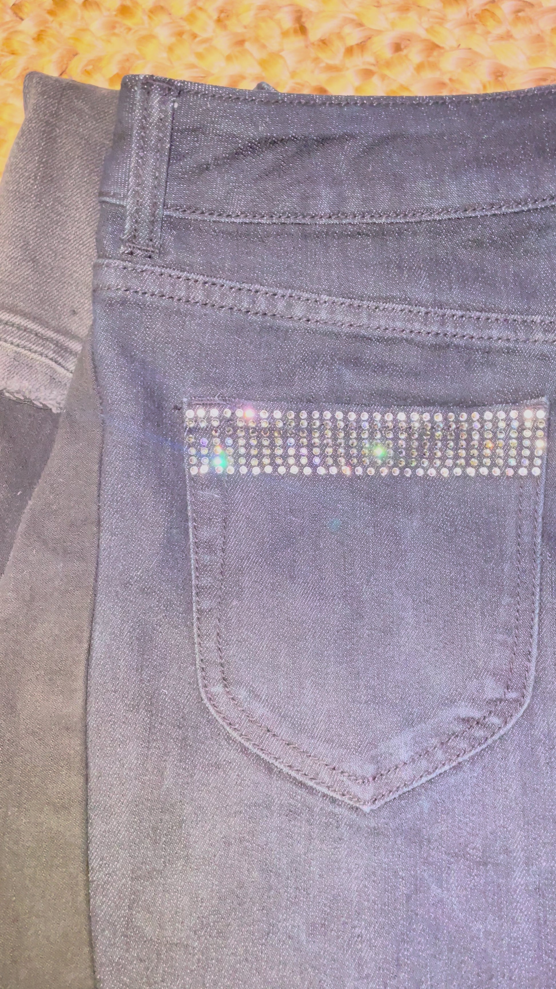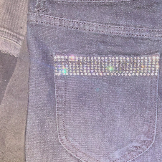 - Blinged out crystal detailing on back pockets, diamond button opening and 2 accent crystals frame the front pockets.